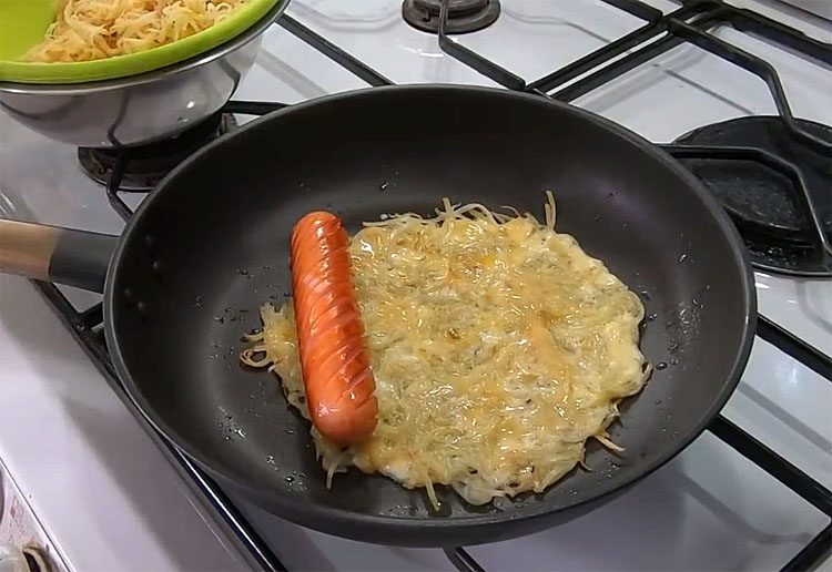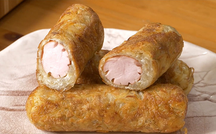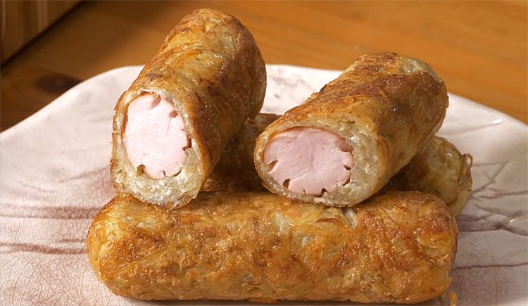 4. На верх каждой порции картошки положите обжаренную сосиску, затем аккуратно сверните картошку, чтобы сосиска оказалась внутри. Обжарте их со всех стороны до золотистого цвета. Когда сосиски с картошкой готовы, переложите их на бумажное полотенце, чтобы убрать лишний жир.