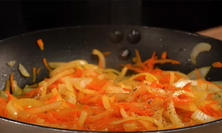 Кусочек курицы кладем на подготовленные овощи. Лук режем полукольцами и пассируем, а морковь натираем на крупной терке и добавляем к нему на сковороду. Солим и перчим и жарим еще пару минут. Маринованные огурцы натираем на крупной терке и добавляем на сковороду.