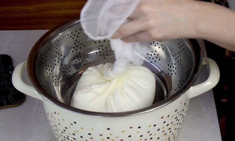 4. Осторожно соберите углы марли и завяжите их, образуя пакет с сгустком внутри. Повесьте марлю с сгустком над раковиной или большой миской, чтобы лишняя жидкость стекла.