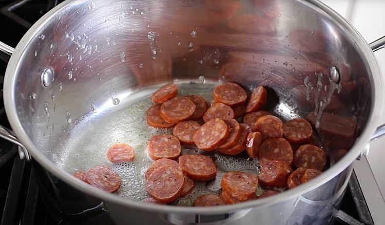 1. Нагрейте 3 столовые ложки сливочного масла в кастрюле на среднем огне. Добавьте нарезанные кружочками сосиски и обжарьте их до золотистости, это обычно занимает около 3 минут. Затем используйте лопатку или шумовку, чтобы переложить обжаренные сосиски на тарелку и оставьте их в стороне.