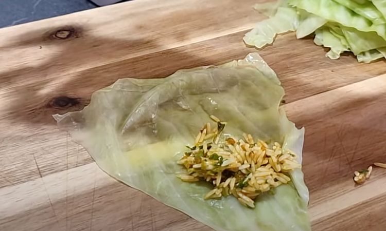 5. На каждый лист капусты положите небольшое количество начинки и заверните, скручивая концы, чтобы создать голубцы.