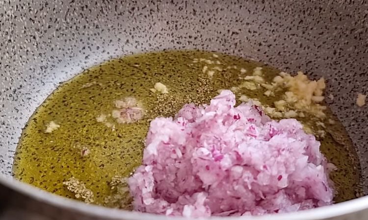 1. Приготовление начинки. Нарежьте лук и чеснок мелко. Натрите помидоры на терке. В сотейнике разогрейте растительное масло на среднем огне. Обжарьте чеснок в масле до золотистого цвета, затем добавьте лук и обжаривайте до мягкости.