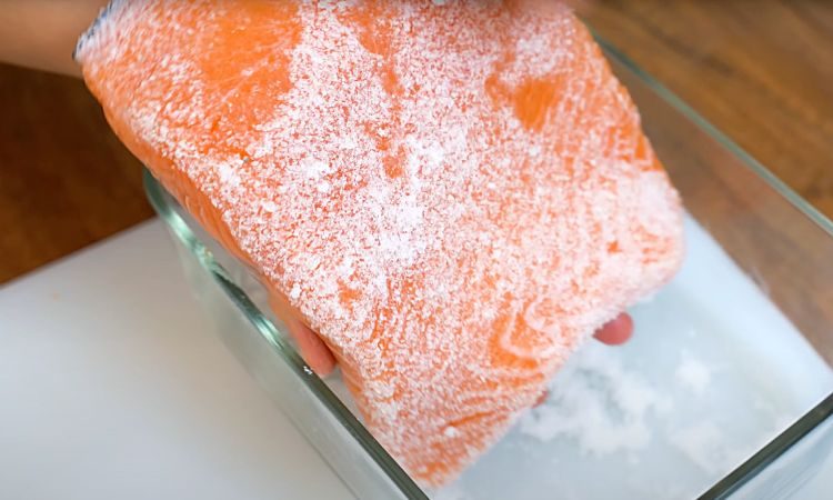Шаг 3: Засолка рыбы. Положите кусок красной рыбы (кожей вниз) в емкость с солью и сахаром. Закройте рыбу оставшейся солью и сахаром сверху. Убедитесь, что рыба покрыта равномерно.