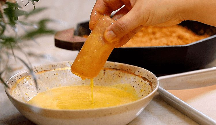 4. В небольшой миске смешайте чесночный соус с молоком. Обмакните каждую заготовку в смесь чесночного соуса и молока, обеспечивая равномерное покрытие. Затем обваляйте каждую заготовку в тертом сыре, чтобы сыр приклеился к мясу.