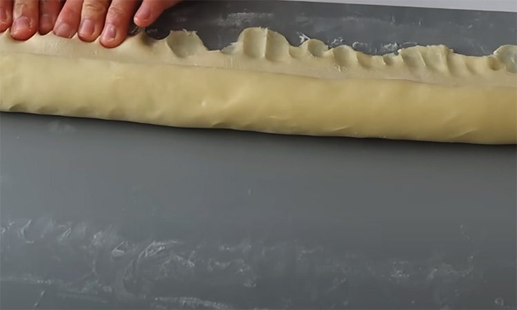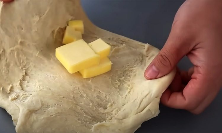 После этого раскатайте тесто на плоской поверхности и добавьте 28 граммов нежирного масла. Замесите тесто, чтобы масло равномерно распределилось. Сформируйте тесто в виде шара, покройте его и снова оставьте на 20 минут. Раскатайте тесто в прямоугольник, смажьте его поверхность маслом и сложите в три слоя. Затем раскатайте его снова и сделайте рулет.