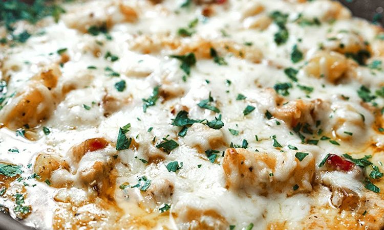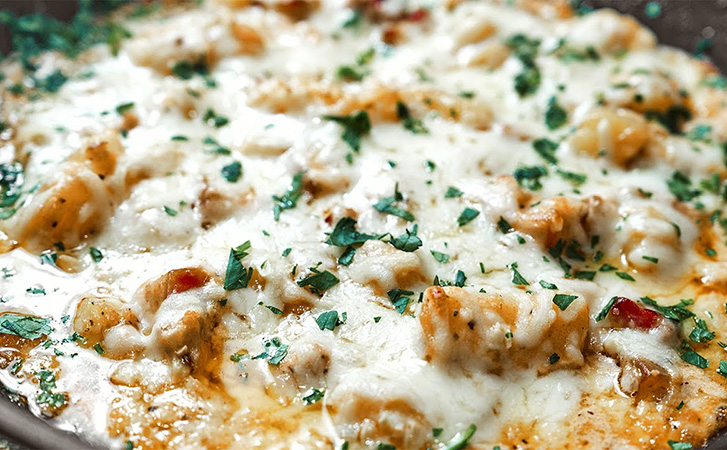 Перемешиваем, засыпаем черный перец, тмин, паприку и соль. Кладем кусочек сливочного масла и вливаем сливки, добавляем плавленный сыр и снова перемешиваем. Теперь измельчаем сюда же чеснок и зелень. Присыпаем тертым сыром и отправляем сковороду в духовку на 10 минут при 200 градусах.