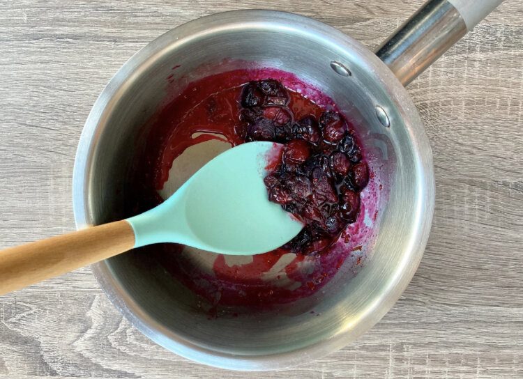Берем 100 грамм свежей или замороженной клюквы и сразу, не размораживая, отправляем в сотейник на медленный огонь. В начале можно добавить чуть-чуть воды, чтобы ничего не пригорело.