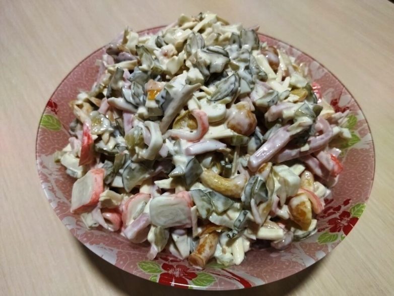 Крабовые палочки, ветчину, маринованные огурчики нарезаем. Сыр натираем на терке. Добавляем грибы (если они крупные, то нарезаем их). Заправляем салат майонезом, перемешиваем и наслаждаемся. Приятного аппетита!