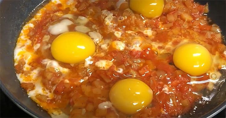 4. Разбейте яйца сверху томатного соуса в сковороде. Равномерно распределите их по поверхности. Готовьте яйца до желаемой степени прожарки. Если вы предпочитаете яичницу с жидким желтком, прикройте сковороду крышкой на последние несколько минут приготовления.
