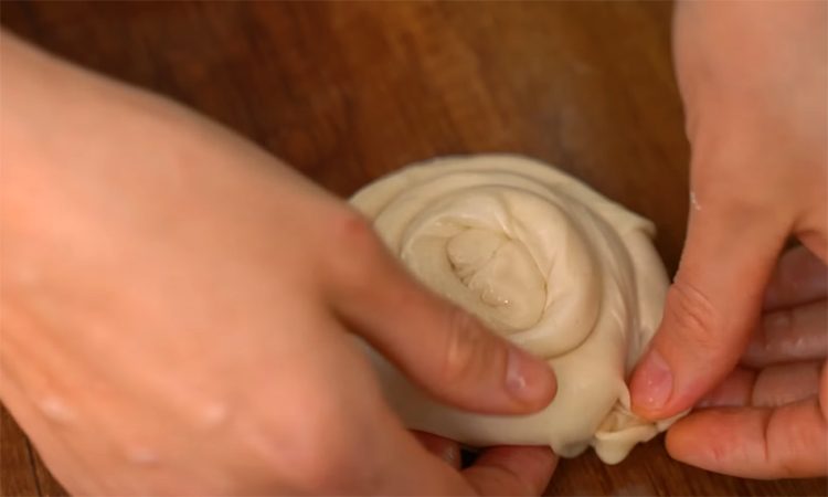 Края сворачиваем к центру, а получившийся прямоугольник сворачиваем в рулет, уже его – в улитку. Раскатайте улитку в лепешку толщиной около 0,5 см и теперь просто обжарьте с обеих сторон на среднем огне до полной готовности, примерно по 3 минуты с каждой стороны.
