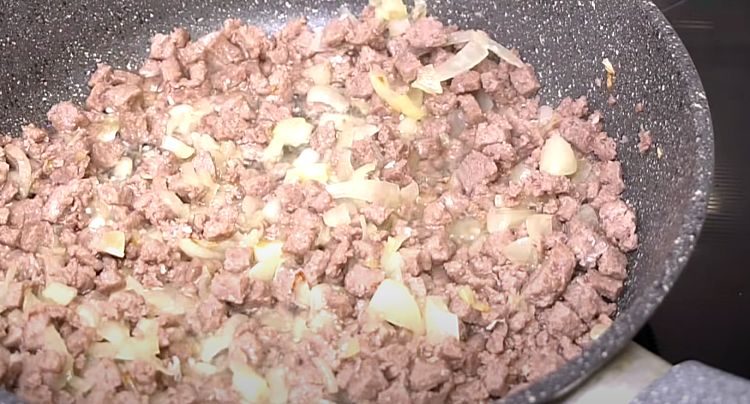 3. Добавьте 100 мл воды в сковороду с фаршем, закройте крышкой и готовьте на среднем огне до полного испарения воды, чтобы получился сочный и ароматный фарш.