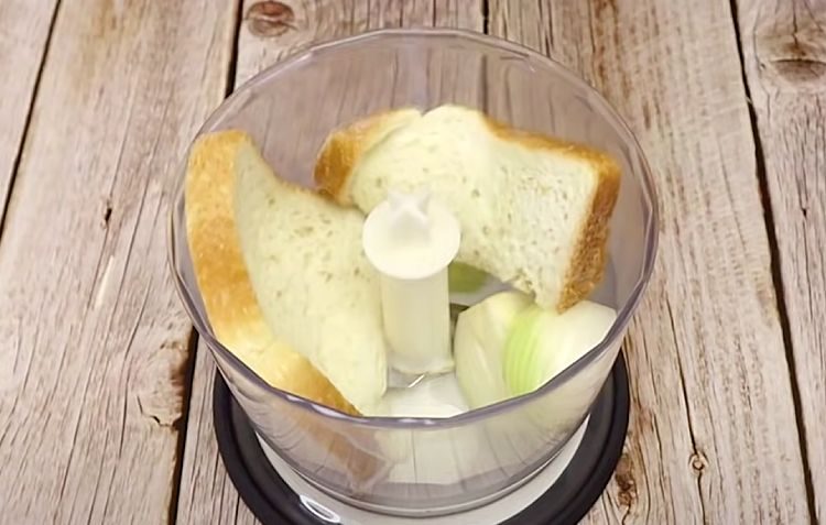 2. Замочите хлеб в молоке, затем поместите в блендер. Нарежьте вторую луковицу и добавьте её в блендер. Перемалывайте до однородной массы.