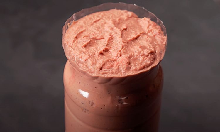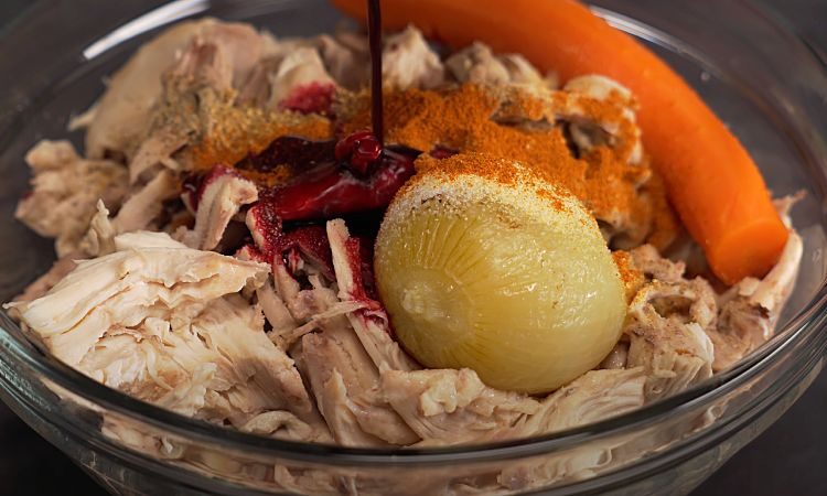 Шаг 3: Смешивание ингредиентов. В большую миску положите куриное мясо, морковь и лук. Добавьте молотый чеснок, черный и красный перец, молотый кориандр, мускатный орех и оставшуюся соль. Залейте смесь свекольным соком и бульоном с желатином. Измельчите блендером до однородности.