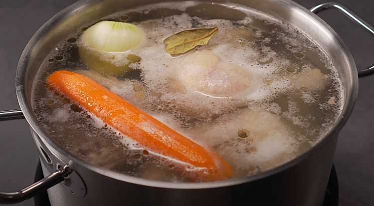 Верните курицу в кастрюлю и залейте 2,5 литрами свежей воды. Добавьте в кастрюлю луковицу и морковь (целиком), лавровый лист и 2 чайные ложки соли. Доведите до кипения, затем уменьшите огонь до минимума, покройте крышкой и варите 2 часа. Во время варки периодически удаляйте образующуюся пену.