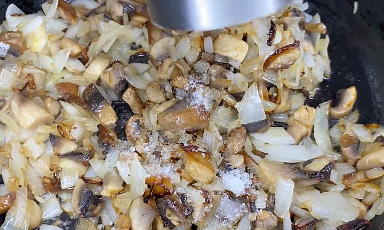 2. Пока картофель варится, нарежьте шампиньоны и лук мелко. Нарежьте копченую куриную грудку на мелкие кубики. Разогрейте сковороду на среднем огне. Добавьте немного масла или масла для жарки и обжарьте лук до мягкости. Затем добавьте шампиньоны и копченую куриную грудку. Обжаривайте, помешивая, пока грибы не станут золотистыми и куриная грудка не подрумянится. Посолите и поперчите по вкусу.