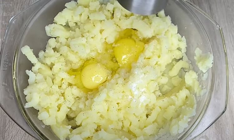 3. В большой миске соедините вареный картофель с двумя яйцами. Перемешайте, пока не получится однородное пюре. Добавьте обжаренные грибы, лук и копченую куриную грудку к картофельному пюре. Тщательно перемешайте, чтобы ингредиенты равномерно распределились. При необходимости добавьте еще соль и перец по вкусу.