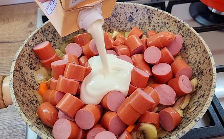 Готовим отменный ужин на семью из 2 сосисок. Изюминка рецепта в добавлении сливок и грибов