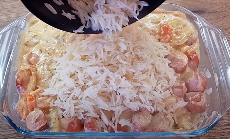 4. Включите духовку и разогрейте её до 200°C. В форму для запекания выложите первым слоем половину приготовленного риса. Сверху распределите слой из сосисок и овощей со сливками. Накройте оставшимся рисом.