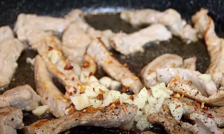 1. Разогрейте сковороду с толстым дном на среднем огне и добавьте немного масла. Обжарьте нарезанное на небольшие кусочки мясо до золотистой корочки, перемешивая, примерно 3-4 минуты. Добавьте измельченный чеснок в сковороду с мясом и перемешайте. Посыпьте мясо щепоткой острого перца и молотым черным и белым перцем по вкусу. Тушите мясо еще пару минут, чтобы чеснок подрумянился и приправы выделили аромат.