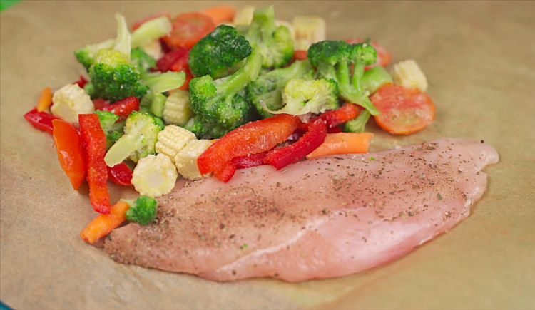 Кладем в конверт и готовим. Куриная грудка и замороженные овощи