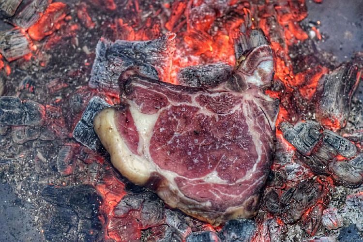 Приготовление. Когда угли раскалятся, распределите их ровным слоем. Сдуйте образовавшуюся золу. Не приправляйте стейки заранее, просто выложите их на угли и готовьте 4-6 минут с каждой стороны для medium-rare.