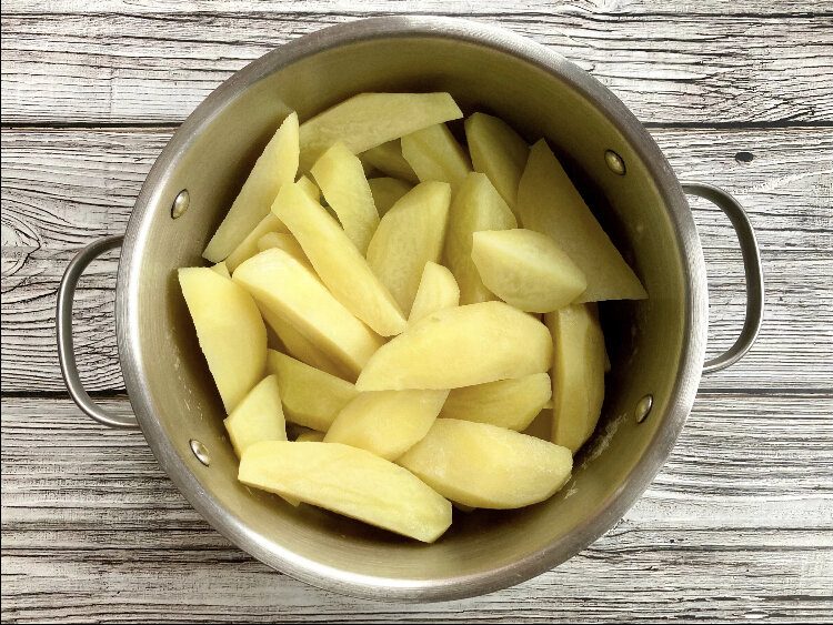 Теперь нарезанную картошку промойте несколько раз в холодной воде (лучше — в проточной). И отправьте ее в кастрюлю с кипящей водой — вариться около трех (!) минут.