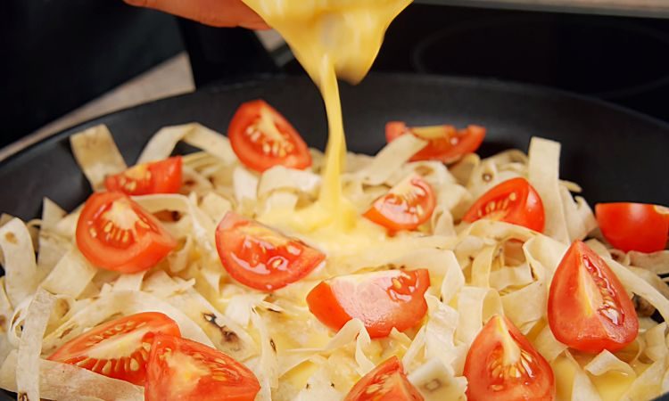 Тонкий армянский лаваш можно использовать не только вместо хлеба. Нарежьте его ножницами на тонкие полоски, и у вас быстро получится отличная альтернатива макаронам. Их не нужно варить, поэтому приготовим на сковороде. Добавим яйца и помидоры, и ужин будет готов всего за 5 минут.