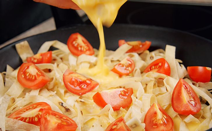 Шаг 3: На сковороде, где подсушивали лаваш, оставьте полоски лаваша. Сверху равномерно распределите нарезанные помидоры. Залейте всё яично-сырной смесью, стараясь, чтобы она равномерно покрыла весь лаваш с помидорами. Накройте сковороду крышкой и готовьте на среднем огне около 7-9 минут. Яйца должны схватиться, а сыр — расплавиться.