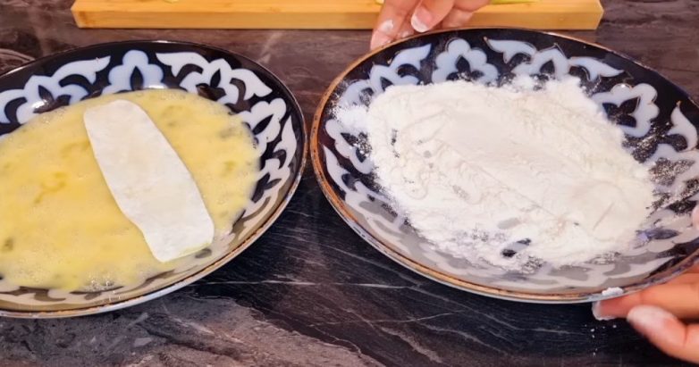 4. В отдельной емкости взбиваем яйца, используя вилку. Во вторую неглубокую тарелку всыпаем пшеничную муку. Стряхиваем овощные слайсы от выделившегося сока. Обваливаем их в муке со всех сторон, а затем обмакиваем в яичной смеси.