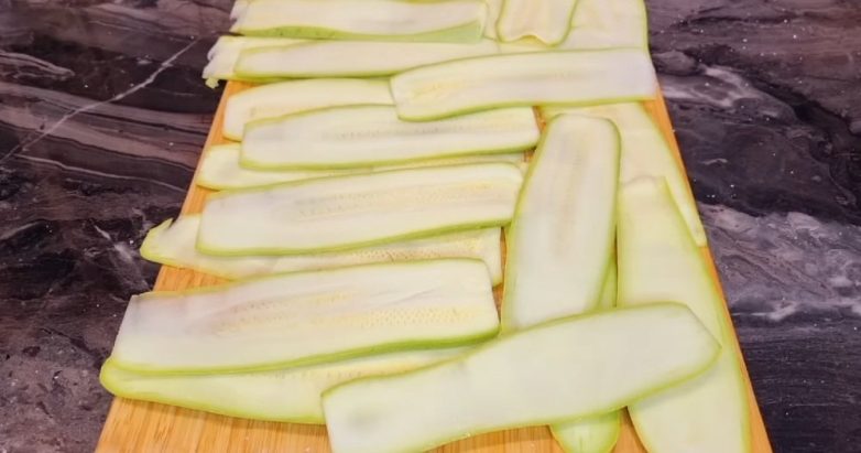 1. Тщательно промываем кабачок. Удаляем плодоножку. Нарезаем кабачок вдоль на тонкие слайсы. Выкладываем их на разделочную доску. Присаливаем овощ. Оставляем его на 10 минут при комнатной температуре.