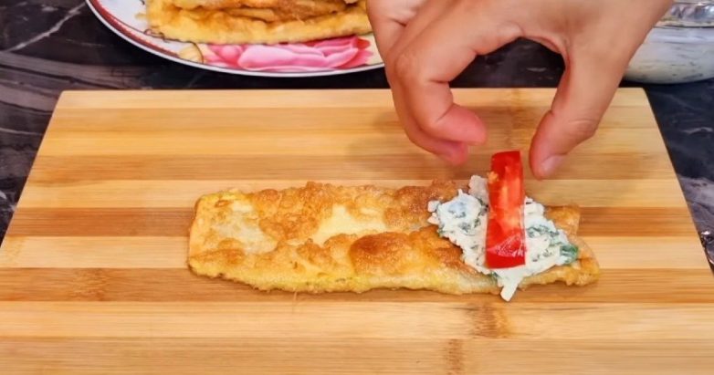 6. Слегка остывший слайс из кабачка выкладываем на разделочную доску. На его край помещаем начинку. Сверху выкладываем помидор, предварительно разрезанный на небольшие ломтики. Сворачиваем всё в плотный рулетик.