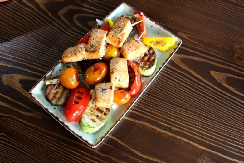 Рыбу нужно помыть и очистить от чешуи. Нарезать крупными квадратными кусочками. Затем добавляем соль, душистый перец, сок лимона и оливковое масло. Все хорошо перемешиваем и оставляем мариноваться на пару часов в холодильнике. Жарить рыбу можно, как на шампурах, так и на решетке. Овощи также жарятся на огне и подаются как гарнир.