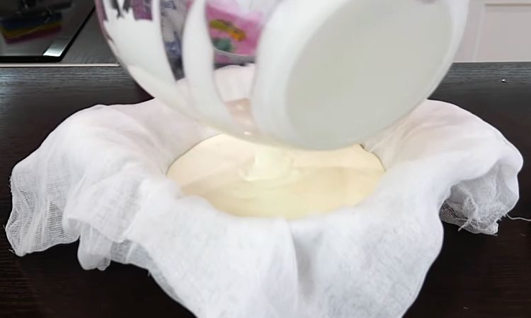 2. В глубокой миске установите сито. Выложите на сито четыре слоя марли так, чтобы края марли свисали за края сита. Осторожно перелейте молочную массу на марлю. Заверните края марли поверх молочной массы, чтобы полностью её покрыть.