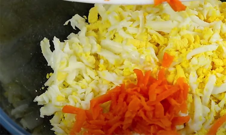 Отварные яйца на крупной терке сразу пропускаем в салатник. Сюда же измельчаем на той же терке морковь и выкладываем фасоль. Сыр предварительно лучше подержать в морозилке 5 минут, а затем тоже на терке пропустить в салатник.