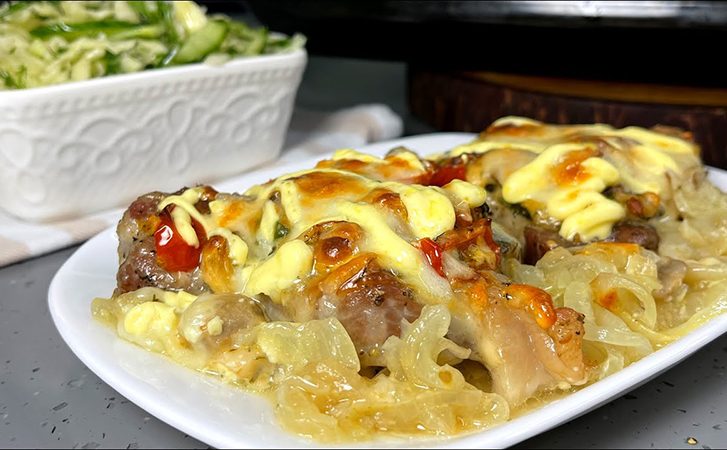 Этот простой рецепт поможет вам без лишних хлопот приготовить полноценный ужин на большую семью. Все делается по принципу «сложили и забыли», основную часть работы здесь делает духовка. Мясо в основе блюда получается очень сочным, поскольку готовится на нежной луковой подушке.