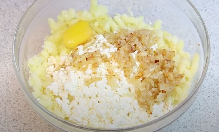 3. После варки картофеля откиньте воду и разомните его в пюре в большой миске. Добавьте обжаренный лук, зернистый творог и одно яйцо к картофельному пюре. Тщательно перемешайте все ингредиенты до получения однородной начинки.