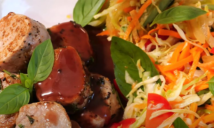 Сочный медальон из свиной вырезки и нежный салат из молодой капусты это идеальное блюдо для летнего обеда, или ужина. Свиная вырезка, обжаренная с зелёным базиликом и чесноком, подаётся с лёгким салатом из молодой капусты с добавлением моркови и томатов. Блюдо сочетает в себе ароматный, насыщенный вкус жареного мяса и свежесть овощей, создавая гармоничное и вкусное сочетание.