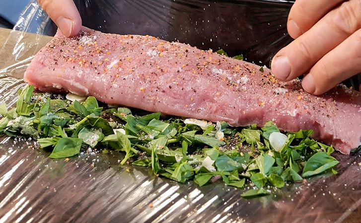 Очистите свиную вырезку от плёнок и лишних частей. Крупно порубите зелёный базилик и чеснок. Натрите свиную вырезку солью, перцем и приправой для свинины. Оберните вырезку базиликом и чесноком. Упакуйте в пищевую плёнку и оставьте мариноваться на час.