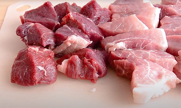 1. Возьмите 700 граммов свинины и 300 граммов говядины. Можно использовать и другое мясо в тех же пропорциях, например, птицу или баранину, в зависимости от вкусовых предпочтений. Нарежьте мясо на небольшие кусочки, чтобы они легко проходили через мясорубку.