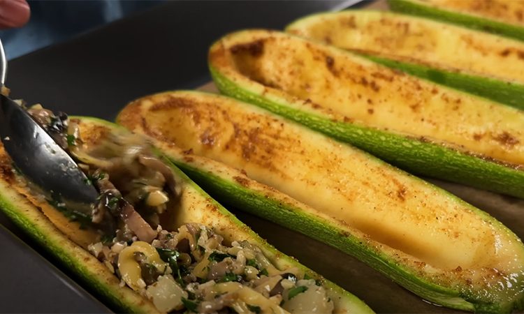 Кабачки разрежьте вдоль пополам и уберите сердцевину ложкой. Смажьте их внутри маслом, добавьте специй и запеките 20 минут при температуре 180 градусов. Тем временем обжарьте вместе мелко нарезанный лук, чеснок, грибы и ананас.