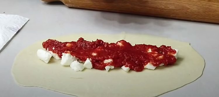 На посыпанной мукой поверхности раскатайте каждый шарик теста в тонкую лепешку диаметром примерно 15-20 сантиметров. На одну половину каждой лепешки выложите порцию нарезанной моцареллы и добавьте дополнительную начинку по вашему выбору. Полейте начинку приготовленным томатным соусом.