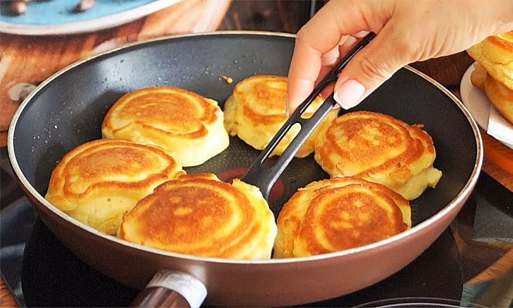 Вместо плоских и пресных оладий, приготовим их так, что они станут похожи на пончики, с ароматной яблочной начинкой внутри.