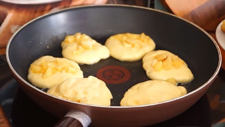 3. Разогрейте большую сковороду на среднем огне. Добавьте немного масла (растительного или сливочного) для жарки. Ложкой выкладывайте порции теста на разогретую сковороду, формируя небольшие лепешки. На каждую лепешку положите немного яблочной начинки. Сверху начинки добавьте еще немного теста, чтобы полностью покрыть яблоки.