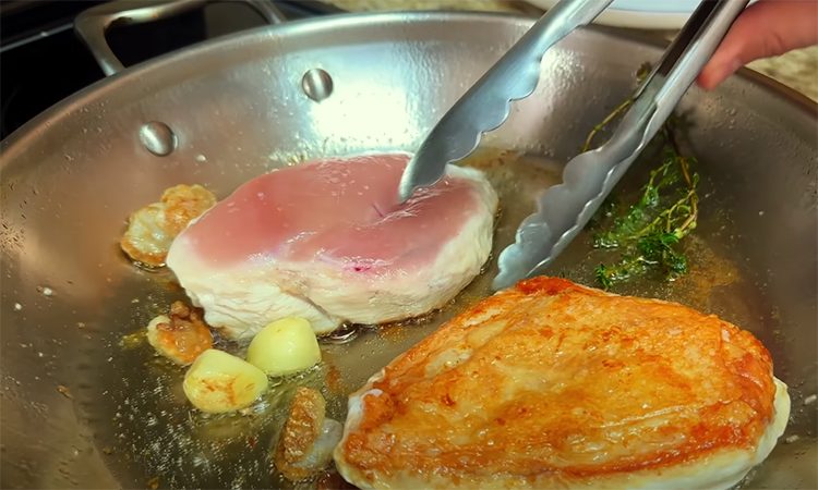 Выложите грудки на сковороду кожей вниз, придавив их для лучшего контакта. Жарьте на среднем огне, пока кожа не станет хрустящей (около 8 минут). Переверните грудки, убавьте огонь и добавьте сливочное масло. Поливайте грудки растопленным маслом для равномерного приготовления. Продолжайте жарить, пока внутренняя температура мяса не достигнет 74°C (около 7 минут).