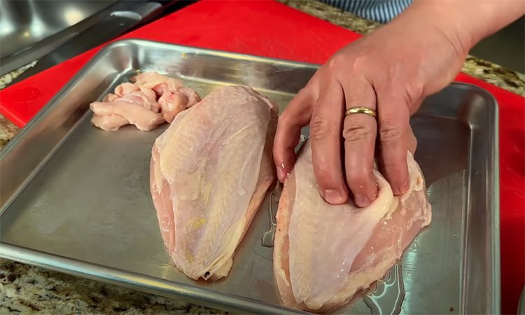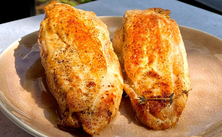 Разделите целую курицу, отделив грудки, ножки и бёдра. Удалите малое филе с грудок, чтобы оно не переготовилось. Прогрейте куриную грудку до комнатной температуры перед готовкой. Нагрейте стальную сковороду с толстым дном. Добавьте немного подсолнечного масла и куриный жир. Посыпьте куриную грудку крупной солью с обеих сторон.