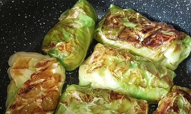 Формирование голубцов: Кладите начинку на капустный лист и заворачивайте плотно. Выложите голубцы на разделочную доску. Обжаривайте голубцы на подсолнечном масле до золотистого цвета с двух сторон. На дно кастрюли положите мелкие листья капусты, лавровый лист и душистый перец.