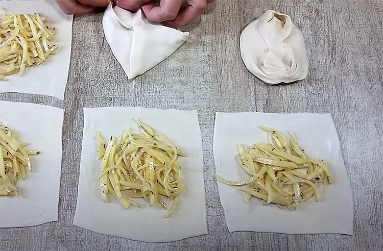 3. Формовка мантов. На присыпанной мукой поверхности раскатайте тесто тонким слоем (около 1-2 мм). Нарежьте тесто на квадраты примерно 10x10 см. В центр каждого квадрата положите 1-2 столовые ложки картофельной начинки. Сложите квадраты пополам, чтобы получились треугольники, и тщательно защипните края.