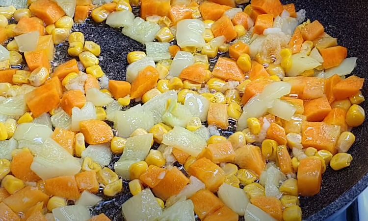 2. На сковороде разогрейте немного оливкового масла. Обжарьте на нем мелко нарезанный чеснок до ароматности. Добавьте на сковороду нарезанный кубиками перец и морковь. Поджаривайте на среднем огне около 6 минут, добавив кукурузу в конце. Переложите овощи в миску.