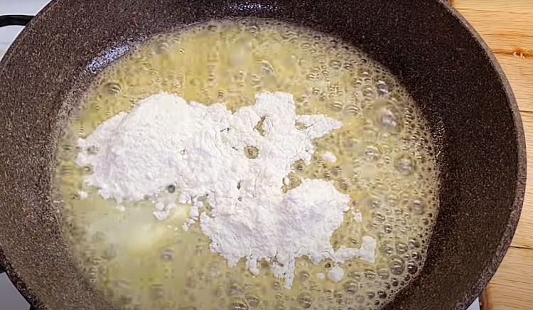 3. На той же сковороде расплавьте сливочное масло, затем добавьте муку. Перемешивайте, чтобы образовалась рулетка. Постепенно добавляйте молоко, продолжая перемешивать, чтобы избежать комков. Варите на среднем огне около 3 минут до загустения.