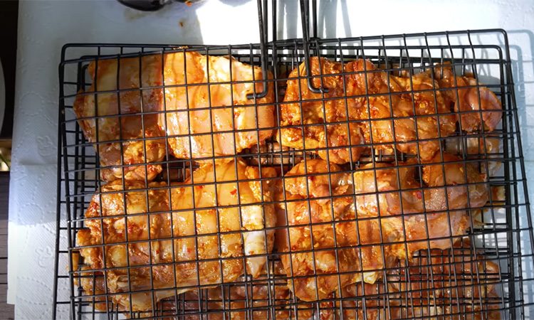 Пока также оставьте их, сделайте соус. Просто смешайте майонез, хмели-сунели, адижику, сметану, черный перец и соль. Переходим к жарке. Курицу разложите на сетку и обжарьте на углях до золотистости, затем оставьте остывать. Тем временем соус смешаем с овощами, это один из главных секретов вкусной шаурмы.